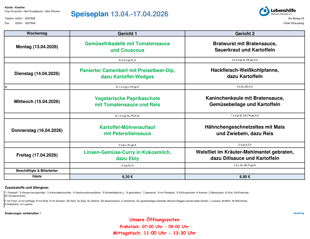 Speiseplan 16. KW 2026 Kantine Strausberg
